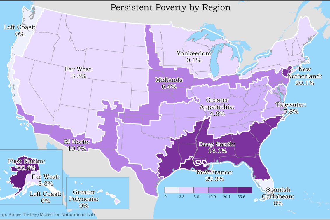 There are impoverished places in the United States, and then there are places that stay impoverished, generation after generation, creating cycles of poverty that are difficult to escape. When you plot them on the map, the geographic divides are clear and striking, especially if you use the American Nations model of regional cultures, as we do at Nationhood Lab.