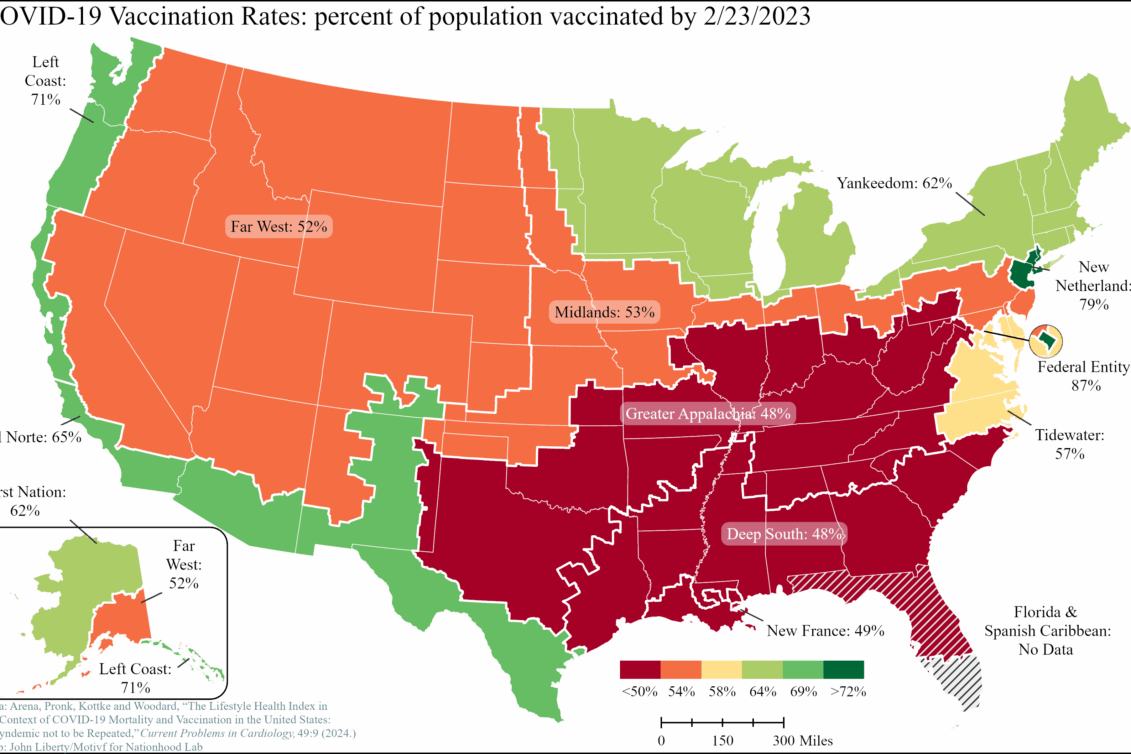 Some of the communitarian regions had all-age vaccination rates more than 20 points higher than in Deep South or Greater Appalachia.